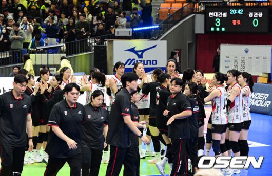 [OSEN=수원, 조은정 기자] 16일 경기도 수원체육관에서 ‘진에어 2025~2026 프로배구 V리그’ 여자부 현대건설과 정관장의 경기가 열렸다. 현대건설은 정관장을 상대로 세트 스코어 3-0(25-20, 25-22, 29-27)으로 승리했다. 정관장이 패배에 아쉬워하고 있다. 2026.01.16 /cej@osen.co.kr