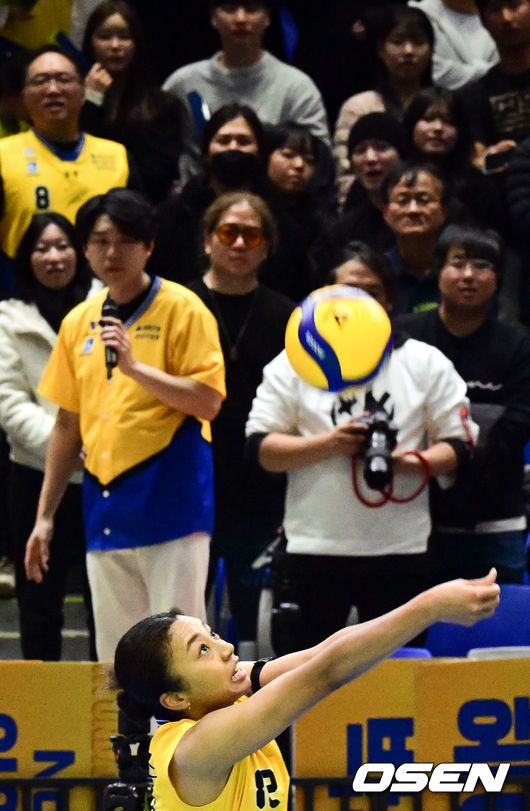 [OSEN=수원, 조은정 기자] 16일 경기도 수원체육관에서 ‘진에어 2025~2026 프로배구 V리그’ 여자부 현대건설과 정관장의 경기가 열렸다. 현대건설은 정관장을 상대로 세트 스코어 3-0(25-20, 25-22, 29-27)으로 승리했다. 3세트 현대건설 자스티스가 세트 패스를 하고 있다. 2026.01.16 /cej@osen.co.kr