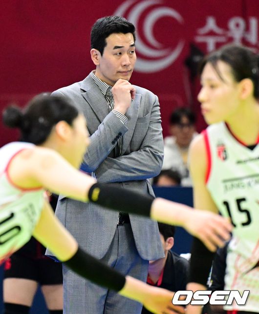 [OSEN=수원, 조은정 기자] 16일 경기도 수원체육관에서 ‘진에어 2025~2026 프로배구 V리그’ 여자부 현대건설과 정관장의 경기가 열렸다. 현대건설은 정관장을 상대로 세트 스코어 3-0(25-20, 25-22, 29-27)으로 승리했다. 3세트 정관장 고희진 감독이 생각에 잠겨 있다. 2026.01.16 /cej@osen.co.kr