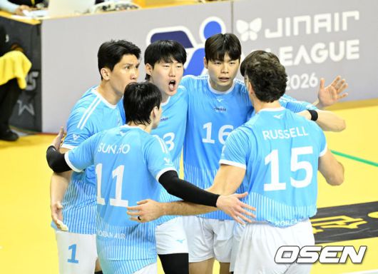 [OSEN=의정부, 이대선 기자] 16일 경기도 의정부시 경민대학교 체육관에서 ‘진에어 2025~2026 프로배구 V리그’ KB손해보험과 대한항공의 경기가 열렸다. 홈팀 KB손해보험은 12승 10패 승점 37로 3위, 방문팀 대한항공은 14승 7패 승점 42로 1위를 기록하고 있다. 1세트 대한항공 선수들이 득점에 환호하고 있다. 2026.01.16 /sunday@osen.co.kr