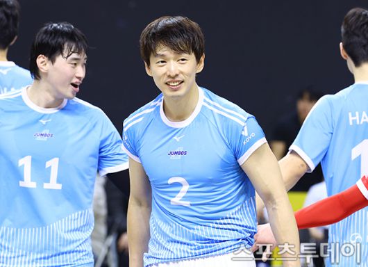 [의정부(경기)=스포츠투데이 팽현준 기자] 16일 경기도 의정부 경민대학교 체육관에서 열린 V리그 남자부 KB손해보험과 대한항공의 경기, 대한항공 한선수가 득점에 기여하며 미소를 짓고 있다. 2026.01.16. [스포츠투데이 팽현준 기자 sports@stoo.com]