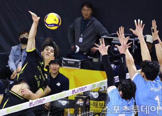 [의정부(경기)=스포츠투데이 팽현준 기자] 16일 경기도 의정부 경민대학교 체육관에서 열린 V리그 남자부 KB손해보험과 대한항공의 경기, KB손해보험 임성진이 공격하고 있다. 2026.01.16.