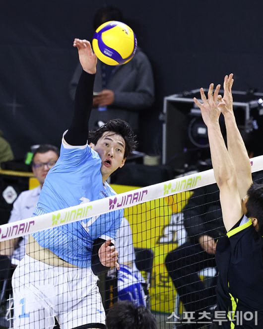 [의정부(경기)=스포츠투데이 팽현준 기자] 16일 경기도 의정부 경민대학교 체육관에서 열린 V리그 남자부 KB손해보험과 대한항공의 경기, 대한항공 김선호가 공격하고 있다. 2026.01.16. [스포츠투데이 팽현준 기자 sports@stoo.com]