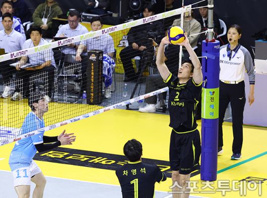 [의정부(경기)=스포츠투데이 팽현준 기자] 16일 경기도 의정부 경민대학교 체육관에서 열린 V리그 남자부 KB손해보험과 대한항공의 경기, KB손해보험 황택의가 토스하고 있다. 2026.01.16. [스포츠투데이 팽현준 기자 sports@stoo.com]