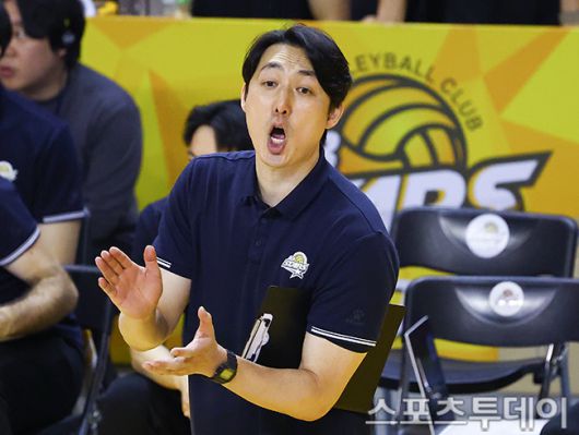 [의정부(경기)=스포츠투데이 팽현준 기자] 16일 경기도 의정부 경민대학교 체육관에서 열린 V리그 남자부 KB손해보험과 대한항공의 경기, KB손해보험 하현용 감독대행이 작전지시를 하고 있다. 2026.01.16. [스포츠투데이 팽현준 기자 sports@stoo.com]