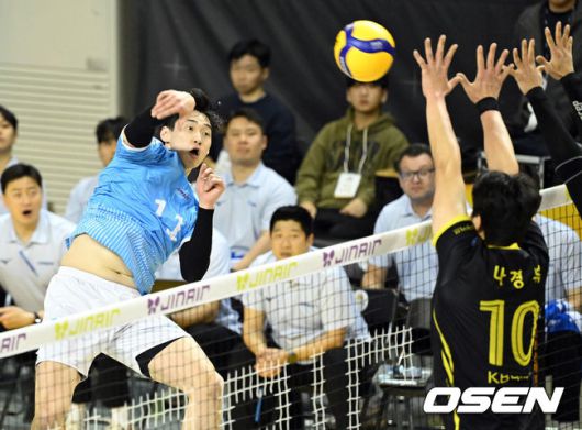 [OSEN=의정부, 이대선 기자] 16일 경기도 의정부시 경민대학교 체육관에서 ‘진에어 2025~2026 프로배구 V리그’ KB손해보험과 대한항공의 경기가 열렸다. 홈팀 KB손해보험은 12승 10패 승점 37로 3위, 방문팀 대한항공은 14승 7패 승점 42로 1위를 기록하고 있다. 2세트 대한항공 김선호가 공격을 시도하고 있다. 2026.01.16 /sunday@osen.co.kr