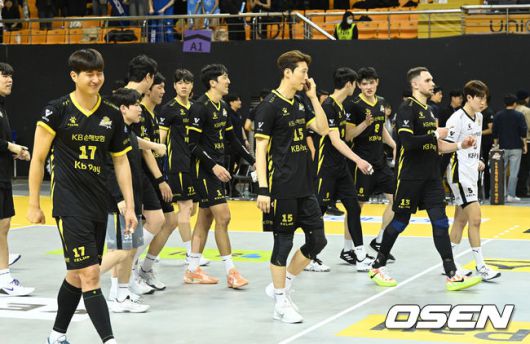 [OSEN=의정부, 이대선 기자] 대한항공은 의정부 경민대학교기념관에서 진행된 진에어 2025~2026 V-리그 KB손해보험과 경기에서 세트스코어 3-1(25-18, 26-24, 31-33, 27-25)로 승리했다. 대한항공은 길었던 4연패에서 탈출했다. 경기 후 KB손해보험 선수들이 아쉬워하고 있다. 2026.01.16 /sunday@osen.co.kr