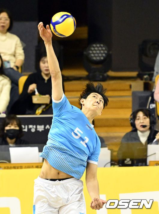 [OSEN=의정부, 이대선 기자] 16일 경기도 의정부시 경민대학교 체육관에서 ‘진에어 2025~2026 프로배구 V리그’ KB손해보험과 대한항공의 경기가 열렸다. 홈팀 KB손해보험은 12승 10패 승점 37로 3위, 방문팀 대한항공은 14승 7패 승점 42로 1위를 기록하고 있다. 1세트 대한항공 김관우가 공격을 시도하고 있다. 2026.01.16 /sunday@osen.co.kr