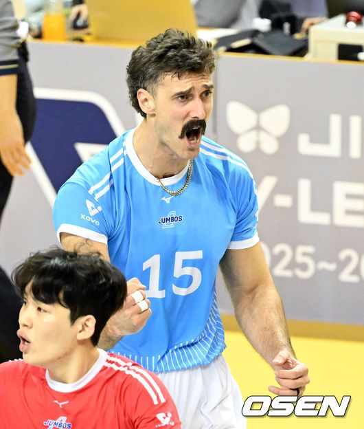 [OSEN=의정부, 이대선 기자] 16일 경기도 의정부시 경민대학교 체육관에서 ‘진에어 2025~2026 프로배구 V리그’ KB손해보험과 대한항공의 경기가 열렸다. 홈팀 KB손해보험은 12승 10패 승점 37로 3위, 방문팀 대한항공은 14승 7패 승점 42로 1위를 기록하고 있다. 1세트 대한항공 러셀이 득점에 환호하고 있다. 2026.01.16 /sunday@osen.co.kr
