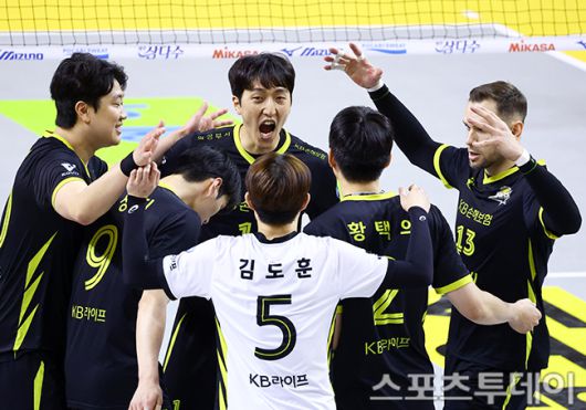 [의정부(경기)=스포츠투데이 팽현준 기자] 16일 경기도 의정부 경민대학교 체육관에서 열린 V리그 남자부 KB손해보험과 대한항공의 경기, KB손해보험이 득점하고 있다. 2026.01.16. [스포츠투데이 팽현준 기자 sports@stoo.com]