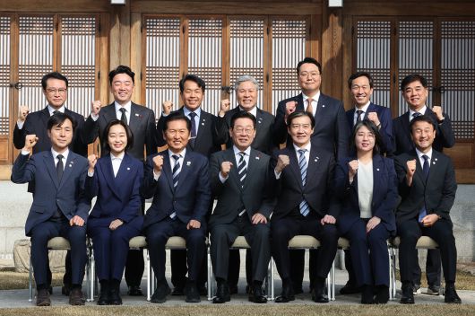 이재명 대통령이 16일 청와대 상춘재에서 열린 여야 지도부 초청 오찬 간담회에서 참석자들과 함께 기념 사진을 촬영하고 있다. 2026.1.16 청와대사진기자단 |