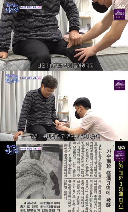 이날 방송에서는 공연을 앞두고 공연장 인근에서 다리 치료를 받는 남진의 모습이 공개됐다. 남진은 마사지사에게 "하루에 네 번, 총 8시간을 뛰다 보니 마사지를 안 받을 수가 없다"며 "왼쪽 다리를 예전에 다쳤다. 뒤에서 칼에 맞아 뼈가 앞으로 튀어나올 정도였다"고 당시 상황을 전했다.