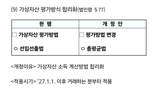 법인이 보유한 가상자산의 평가 방법도 선입선출법에서 총평균법으로 변경된다. 잦은 매매로 인한 평가 왜곡과 실무 부담을 줄이기 위한 조정이다.