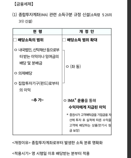 금융투자 과세 체계도 손질됐다. 종합투자계좌 IMA를 통해 발생한 수익은 배당소득으로 분류돼 15.4% 세율이 적용된다. 소득 성격이 불분명했던 부분을 정리해 과세 기준의 일관성을 확보했다는 설명이다.