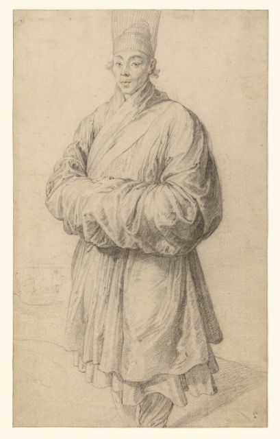 1983년 영국 크리스티 경매장에서 처음 공개됐을 당시 한복과 유사한 복장으로 해당 별칭이 붙었다. 이후 '안토니오 꼬레아'라는 실존 인물이라고 추정했다. 현재도 소장처인 폴 게티 미술관에는 그렇게 소개하고 있다. 하지만 최근 국내외 학계에서는 해당 인물이 명나라 상인이라는 증거가 제시됐다.