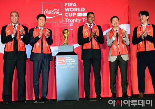 [포토]FIFA 월드컵 트로피 공개…축구 레전드들, 한국 선전 기원