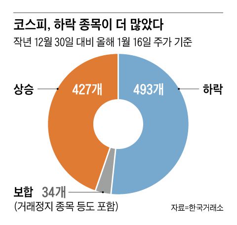 하지만 올 들어 16일까지 유가증권시장에서는 상승 종목이 427개인데, 하락한 종목은 493개로 오히려 떨어진 종목이 66개 더 많다.