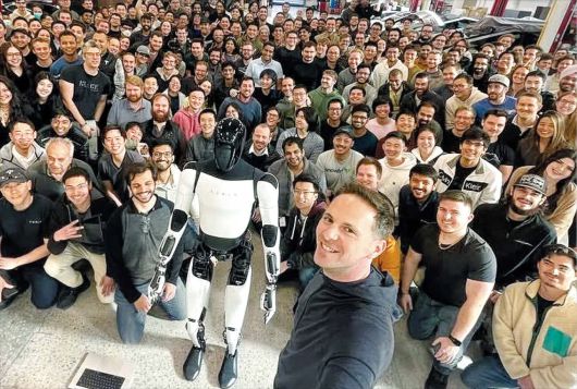X옵티머스 개발진과 기념 촬영 자신이 개발을 주도한 휴머노이드 로봇 옵티머스를 앞에 두고 동료 직원들과 기념 촬영을 하고 있는 밀란 코박 전 부사장(맨 앞 서 있는 이). 현대차그룹은 16일 그를 자문역으로 영입했다고 밝혔다.