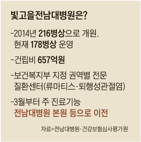 전남대병원 본원에서 차로 30분 거리에 있는 빛고을전남대병원은 2008년 보건복지부 지정 ‘권역별 전문 질환 센터’로 2014년 개원했다. 국비 250억원, 시비 110억원, 전남대병원 자체 예산 297억원 등 총 657억원이 투입됐다. 개원 당시 11개 진료과, 216병상 규모의 ‘병원급’으로 출발했다가, 이후 진료과를 20개까지 늘려 2020년에 종합병원으로 지정됐다. 현재 9개과, 178병상만 남았다. 개원 이후 연평균 14만명의 환자를 진료했다.