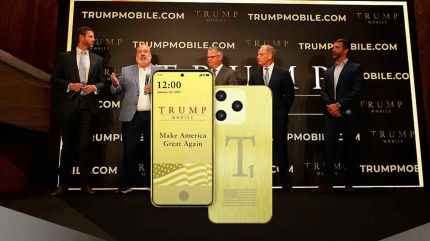 황금색 배경화면에 선명하게 박혀있는 트럼프 모바일, 성조기 이미지를 강조한 트럼프 스마트 폰도 광고했는데, 트럼프의 둘째 아들 에릭 트럼프가 미국산이라는 점을 강조합니다.