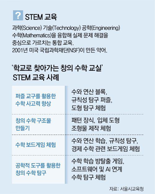 입시에 무게를 둔 인문계 고교와 외국어고의 경우 STEM 교육을 학내 동아리 위주로 활용하고, 상대적으로 입시에서 자유로운 특성화학교는 정규 과정에 편성하기도 한다. 공업계 특성화학교인 서울 미래산업과학고는 수학과 정보 과목을 연계하는 융합교육을 하고 있다. 학생들은 기상청과 통계청 등의 데이터 자료를 활용해 강수 확률에 따라 우산을 챙겨야 하는 확률을 계산하는 등 실생활과 밀접한 문제를 푼다. 김정태 미래산업과학고 교사는 “학생들이 정보 과목을 통해 컴퓨터 등을 배울 때 수학이 꼭 필요하다는 것을 스스로 깨닫도록 지도한다”며 “STEM 교육이 더욱 활성화된다면 학생들이 자신의 미래 진로를 찾는 데 많은 도움이 될 것”이라고 말했다.