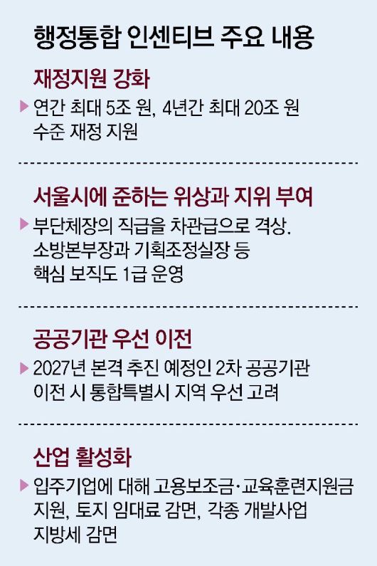 김민석 국무총리는 이날 정부서울청사에서 “정부는 행정통합을 성공적으로 추진하고, 통합이 곧 지방의 성장으로 연결될 수 있도록 지역 주민이 체감할 수 있는 4대 분야에 대한 파격적인 인센티브를 마련했다”며 재정 지원, 위상 강화, 공공기관 우선 이전, 산업 활성화 등 통합 특별시 인센티브를 발표했다. 우선 정부는 통합 특별시에 연간 최대 5조 원, 4년간 최대 20조 원을 지원하기로 했다. 내년도 대전·충남, 광주·전남의 예산안 합계가 각각 약 19조 원, 20조 원인 점을 감안할 때 행정통합이 성사될 경우 기존 예산의 25%에 이르는 추가 재정 지원을 하겠다는 것이다.
