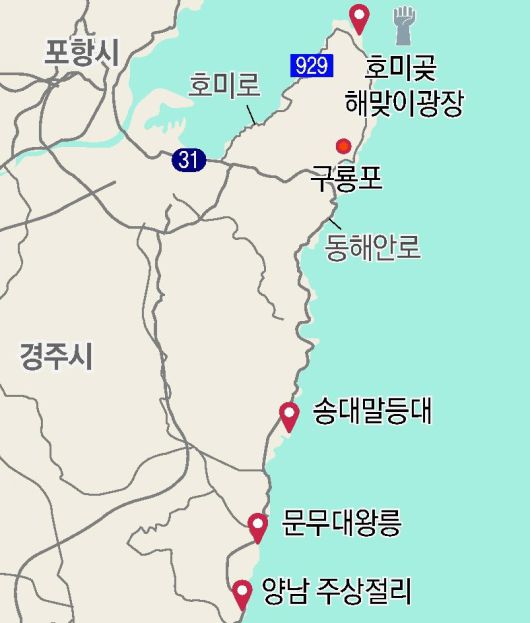 경주역으로 가는 길에는 호미반도 해안둘레길 1코스를 둘러봤다. 해병대 상륙 훈련장으로 사용되는 백사장을 걷다가 시인 이육사 조형물을 만났다. 시인은 휴양차 포항에 머물던 1936년 청림동 청포도 농장을 바라보며 ‘청포도’ 시를 구상했다고 한다. 인근 ‘촌놈물회’의 시원한 물회 한 그릇이 여행을 청량하게 마무리해 줬다.