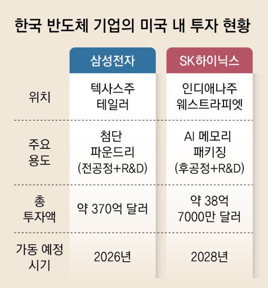 반도체 업계에 따르면 16일 현재 삼성전자는 이미 텍사스주 오스틴에서 파운드리 공장을 운영 중이고, 2026년 가동을 목표로 텍사스주 테일러 지역에 370억 달러 규모의 반도체 공장을 짓고 있다. SK하이닉스는 2028년 가동을 목표로 인디애나주 웨스트라피엣에 38억7000만 달러 규모의 고대역폭메모리(HBM) 패키징 공장을 건설할 예정이다. 투자가 진행 중이지만 규모 면에서는 TSMC가 미국 내 공장을 5개 추가 신설하기로 한 대만과 차이가 작지 않다.