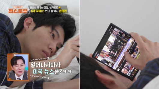 이날 손태진은 아침에 일어나자마자 핸드폰을 잡고 해외 뉴스를 챙겨서 보는 일상을 그렸다.