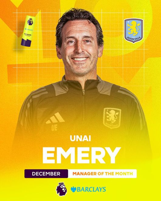 PL 사무국은 16일(한국시간) "12월에 5승을 거두면서 PL 우승 경쟁을 이어가고 있는 아스톤 빌라. 이 성과로 에메리 감독이 12월 이달의 감독상을 수상했다"라고 공식 발표했다.