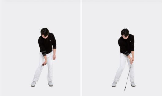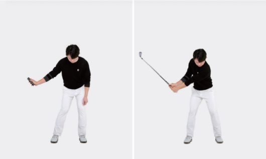 우선 휴대폰을 오른손으로 쥐고 어드레스 자세를 취한다. 휴대폰의 액정(화면)은 목표 방향을 가리킨다. 몸통을 회전해 오른손을 백스윙 톱 위치로 가져간다. 이제 화면은 자신의 오른쪽(타깃 반대 쪽)을 향한다. 이 상태에서부터는 휴대폰 화면이 계속 오른쪽의 벽을 바라보게 한다고 생각한다. 오른팔을 펴고 손목의 꺾인 각도를 이용해 화면이 벽을 쓸듯이 폭넓게 내려오게 하는 연습을 몇 차례 해준다. 팔꿈치를 굽혀 화면이 자신을 바라보거나 팔꿈치를 당겨 화면이 정면을 향하는 일이 없도록 신경을 쓴다. 정확한 동작으로 오른손이 허벅지 옆까지 내려오면 휴대폰 화면은 볼 쪽을 바라보게 된다. 손바닥이 지면을 향하며 바닥을 쓰는 듯한 느낌이 들 것이다.