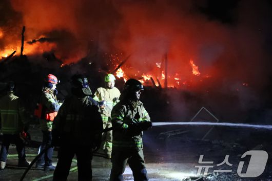 14일 오후 7시 11분쯤 경북 영천시 화산면 가상리 주택에서 원인을 알 수 없는 불이 나 현장에 출동한 소방관들이 진화하고 있다. 주택에서 시작된 불은 인근 백학산으로 옮겨붙은 것으로 전해졌다. 2026.1.14/뉴스1 ⓒ News1 공정식 기자 |