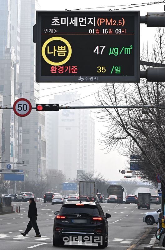 미세먼지와 초미세먼지 농도가 ‘나쁨’ 수준을 보인 16일 경기 수원시청 인근 대기환경정보 전광판에 미세먼지 관련 정보가 표시되고 있다.(사진=뉴시스) |
