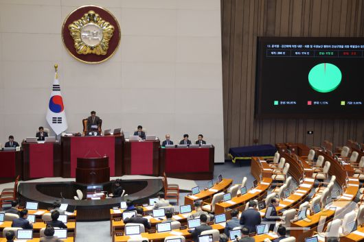 16일 서울 여의도 국회에서 열린 제431회 국회(임시회) 제1차 본회의에서 윤석열·김건희에 의한 내란·외환 및 국정농단 행위의 진상규명을 위한 특별검사 임명 등에 관한 법률안(2차 종합 특검법)이 재석 174인 중 찬성 172인, 반대 2인으로 가결되고 있다. 2026.1.16/뉴스1 ⓒ News1 신웅수 기자 |