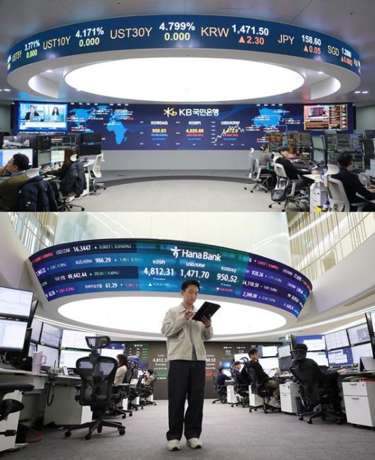 서울 영등포구 소재 KB국민은행 딜링룸(상)과 서울 중구 소재 하나은행 딜링룸(하) 전경. 현황판에 4800을 돌파한 코스피지수가 표시된 모습 [사진=각 사] |