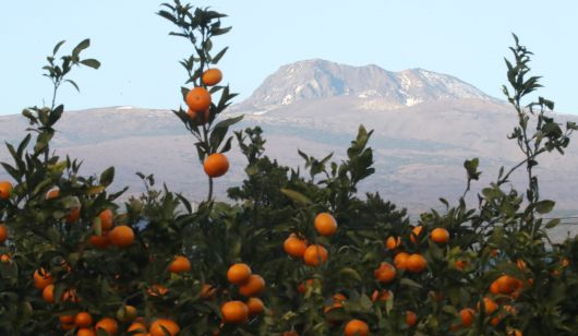 제주 서귀포 강정동의 감귤밭 뒤로 하얗게 눈이 쌓인 한라산 정상부가 보인다. /뉴스1 |