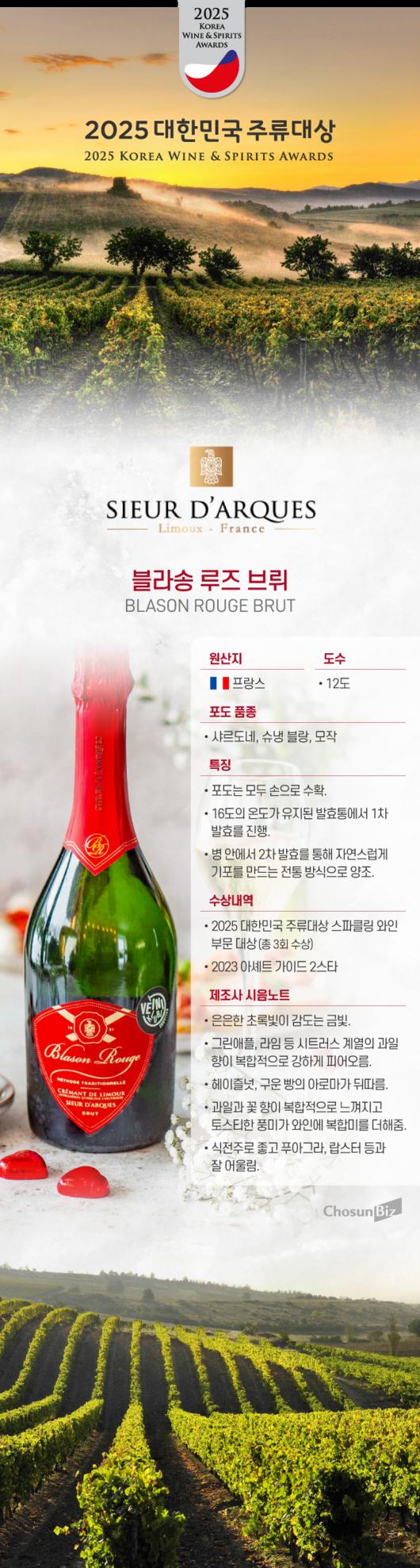 씨에르 다르끄의 대표 제품 중 하나가 ‘블라송 루즈 브뤼(Blason Rouge Brut)’다. 샤르도네 70%, 슈냉 블랑 20%, 모작 10%를 블렌딩해 만든다.