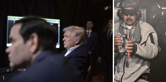 1 도널드 트럼프 미국 대통령이 1월 3일 플로리다주 자신의 별장인 마러라고 리조트에서 베네수엘라 침공 작전을 지켜보고 있다. 미 백악관·UPI연합 2 미 백악관은 ‘확고한 결의’로 명명된 침공 작전 직후 눈과 귀가 가려진채 미 해군 상륙함 이오지마함으로 압송된 마두로 대통령을 공개했다. /사진 미 백악관·EPA연합 |