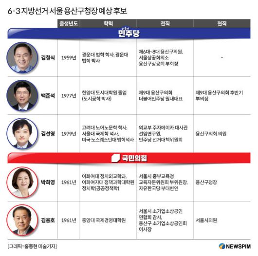[서울=뉴스핌] 백승은 기자 = 오는 6월 3일 전국동시지방선거가 치러지는 가운데 용산구청장 후보에 관심이 고조되고 있다. 용산은 강북권 핵심 지역인 '마용성(마포·용산·성동)' 중 한 곳이기도 하면서 정치·사회적 이슈가 복잡하게 얽혀 있는 지역구다.
