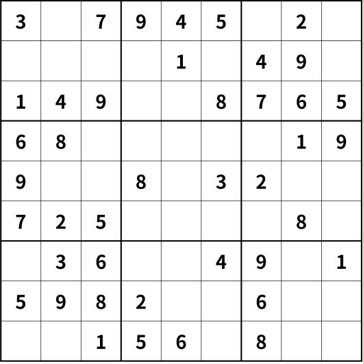 ※ 스도쿠 규칙: 숫자 1~9를 ①세로 9칸에 한 번씩만 써서 채운다. ②가로 9칸에도 한 번씩만 써서 채운다. ③굵은 선의 작은 사각형 3칸×3칸에도 한 번씩만 써서 채운다.