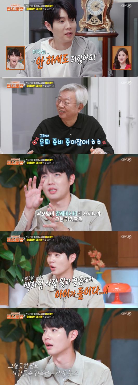 그런가하면 손태진의 아버지는 손태진의 가짜뉴스에 대해 이야기하기도 했다. 손태진은 "부모님이 말레이시아 사시니까 말레이시아 관련 가짜뉴스가 나왔다"며 "제가 백화점 사장 딸이랑 결혼해서 아이가 둘이라더라. 어느 정도 사실을 넣으니까 사람들은 믿게 된다"고 토로했다. 아버지는 "내가 그 얘기를 듣고 정말 그랬으면 좋겠다고 했다"며 웃어넘겼고 손태진은 "아버님은 아이가 둘이라 하니까 좋아하시더라"라고 덧붙였다.