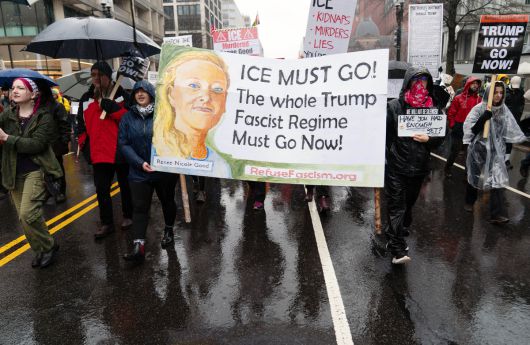 10일(현지시간) 미국 워싱턴에서 시민들이 이민세관단속국(ICE) 요원의 총격으로 숨진 르네 니콜 굿을 추모하고 ICE 단속을 반대하는 손팻말을 들고 백악관을 향해 행진하고 있다. AP연합뉴스 |