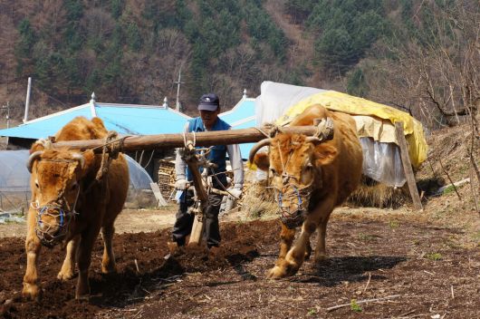 2011년 4월, 강원 춘천시 동면 품걸리에서 한 ‘밭갈애비’(농부)가 겨리연장을 이용해 ‘보냄갈이’(새해 첫 밭갈이)를 하고 있다. 김세건 교수 제공 |
