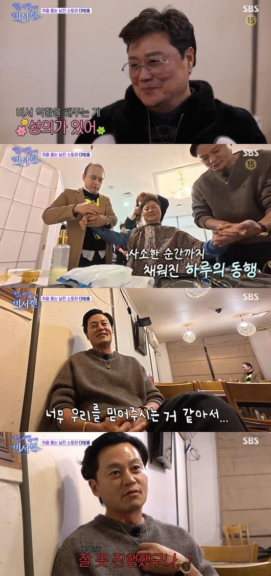 한편, 남진은 “편안하고 반가운 느낌? 비서 역할을 해주는 게 성의가 있다. 해줘야 되니까 하는 거 하고 편안하고 정겨운 거 하고 다 느끼지 안한. 진정으로 하는 게 보이니까 부족하든 어떻든 관계없이 흐뭇했다”라며 “다음에 시간이 있으면 또 왔으면 좋겠다”고 ‘비서진’에 대한 만족감을 드러냈다.