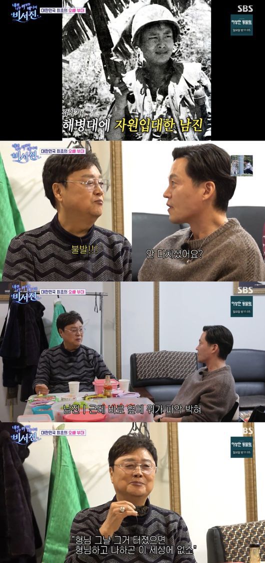 남진은 “나 밥 먹다가 여기서 (왼쪽에서) 폭탄 터졌다. 근데 불발이었다”라며 “‘쉬잉’ 소리가 나더라. 전부 엎드렸다. 바로 옆에 폭탄이 박힌 거다. 모래 박혀서 헛바퀴 돌았다. 스물 몇 살때니까 겁이 없지. 그때 나와 있던 사람이 ‘그날 그거 터졌으면 형님하고 나하고 이 세 상에 없다’고 하더라”라고 전했다.