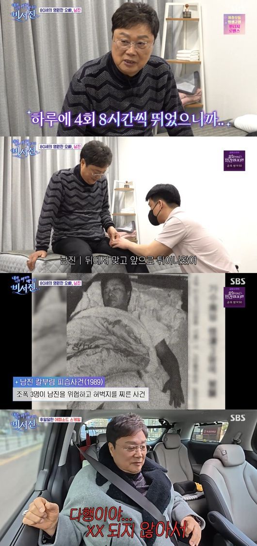 이때 남진은 마사지사에게 “내가 왼쪽 다리를 다쳤다. 옛날에 연장을 맞았다. (허벅지) 여기로 칼이 들어왔다. 뒤에서 맞고 앞으로 튀어 나왔다. 조금만 1mm만 빗나갔어도 불구였다”라며 1989년 조폭 3명이 자신의 허벅지를 칼로 찌른 사건을 떠올렸다.