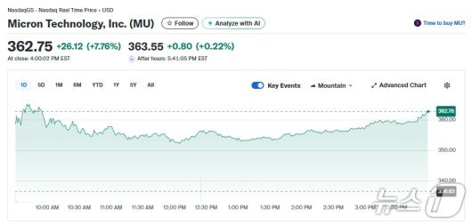 16일(현지 시각) 뉴욕증시에서 마이크론은 7.76% 급등한 362.75달러를 기록했다. 이로써 시총도 4082억달러로 집계돼 4000억달러를 돌파했다.