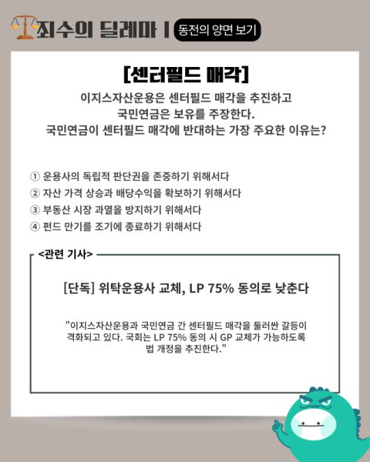 ▶기사 바로가기: [단독] 이지스, 국민연금 자산 매각 후폭풍···위탁운용사 교체, LP 75% 동의로 낮춘다 [시그널]
