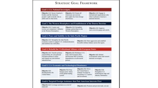 미 국무부의 '2026-2030 회계연도 전략계획'에 따르면 국무부는 5개년 외교 목표로 ▲미국의 국가 주권 강화 ▲서반구에서의 '돈로 독트린' 확립 ▲인도·태평양에서의 평화와 안정 ▲ 유럽 국가들과의 동맹 재건 ▲기술·지배적 우위 확보 ▲국익 최우선의 대외 원조 등 크게 6가지 방향을 제시했습니다.