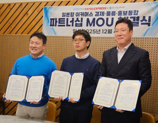 글로벌 커머스 결제 플랫폼 핑퐁페이먼트, 일본 물류 전문기업 세이고, 일본 시장 풀필먼트 서비스 운영사 SC홀딩스는 지난 2025년 12월 4일 서울 삼성동 핑퐁페이먼트 사무실에서 한일 간 전자상거래 물류 효율성 강화를 위한 3자 업무협약(MOU)을 체결했다고 17일 밝혔다.